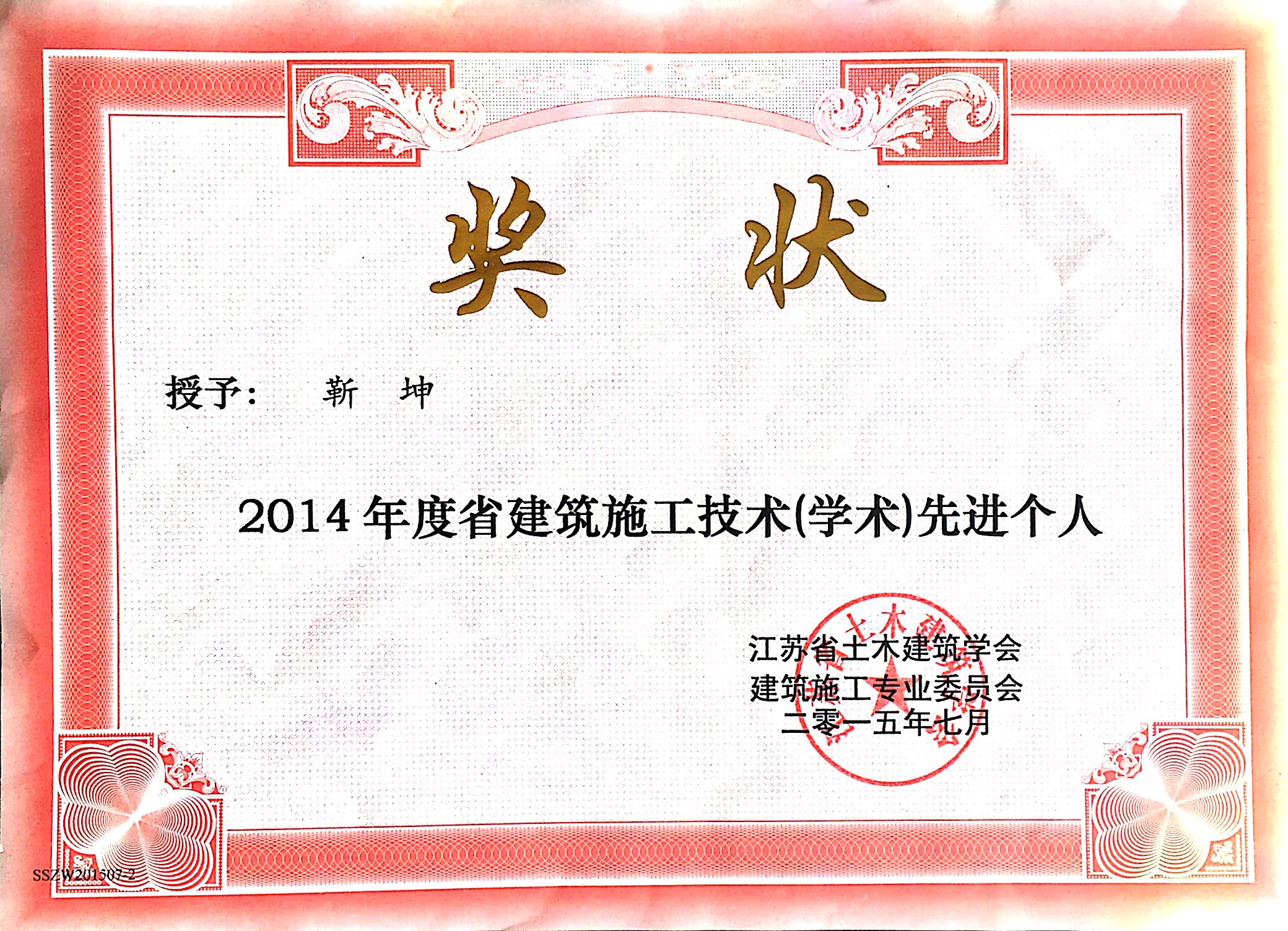 靳坤被授予2014年度省建筑施工技術(shù)(學(xué)...