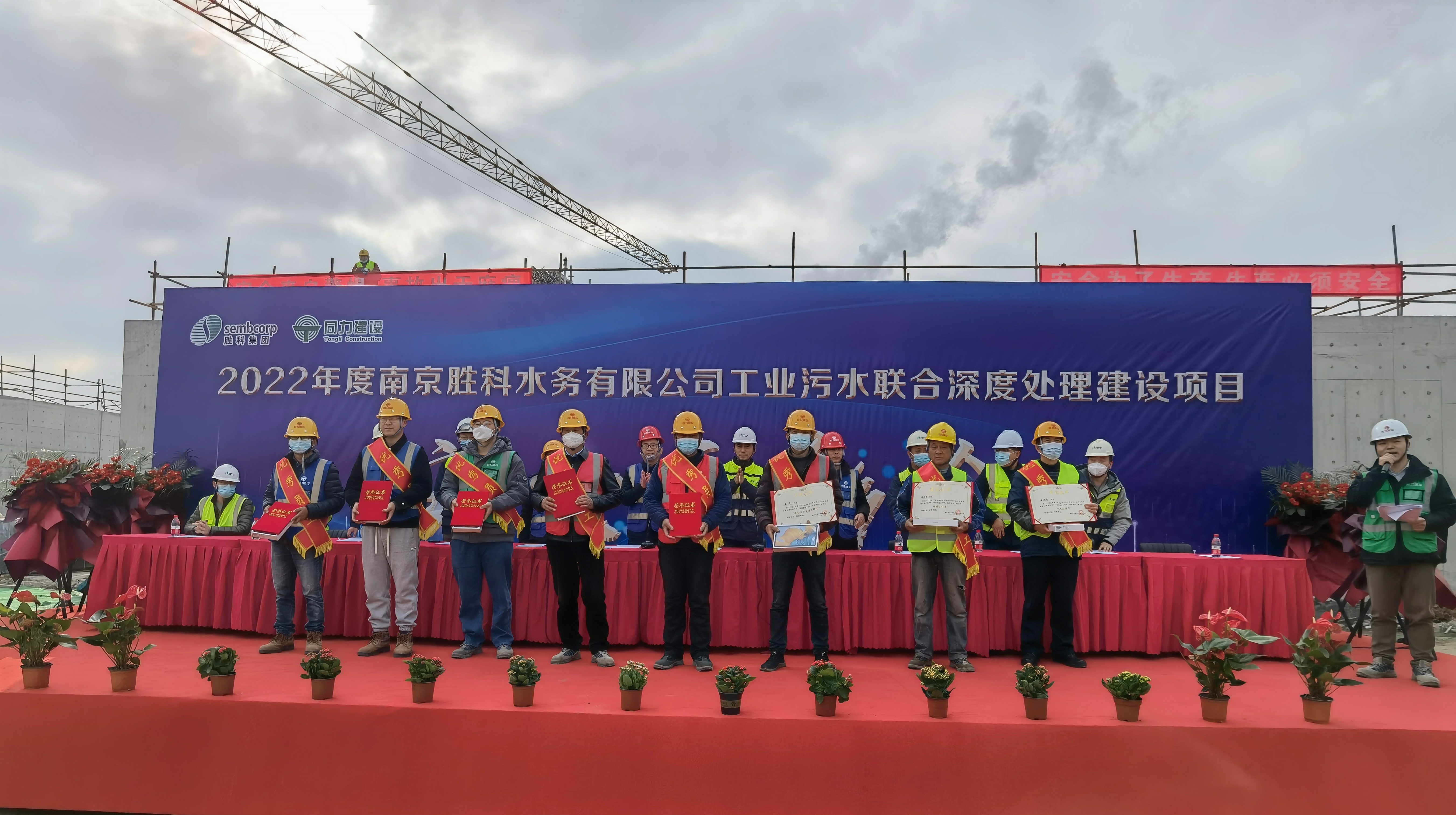 大會宣讀《關(guān)于2022年度南京勝科水務(wù)有限公司工業(yè)污水聯(lián)合深度處理建設(shè)項目安全表彰人員名單》,共計8人,并對現(xiàn)場所以參建工作者給予獎勵,參會領(lǐng)導(dǎo)給予獲獎人員頒發(fā)榮譽證書及獎品。